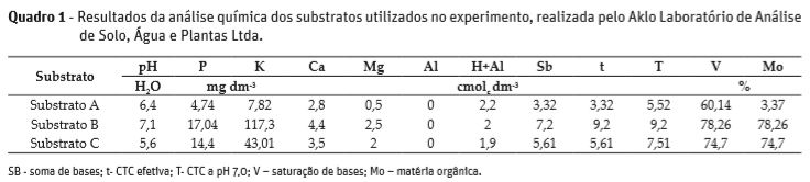Os tratamentos foram constituídos de três proporções de substratos (A: 100% solo; B: 75% solo + 25% de esterco bovino e C: 75% solo + 25% substrato comercial Vivatto Slim Plus®) e cinco ambientes de luz (malha vermelha, malha azul, malha termorrefletora e  malha preta, todas com 50% de irradiância e a pleno sol). O solo utilizado foi coletado na camada de 0-20 cm de profundidade, de um Latossolo Amarelo em área de pastagem natural, do campus da UFRB. O solo e o esterco bovino foram passados em peneira de malha de 4 mm. Os resultados da análise química dos substratos são apresentados no Quadro 1.