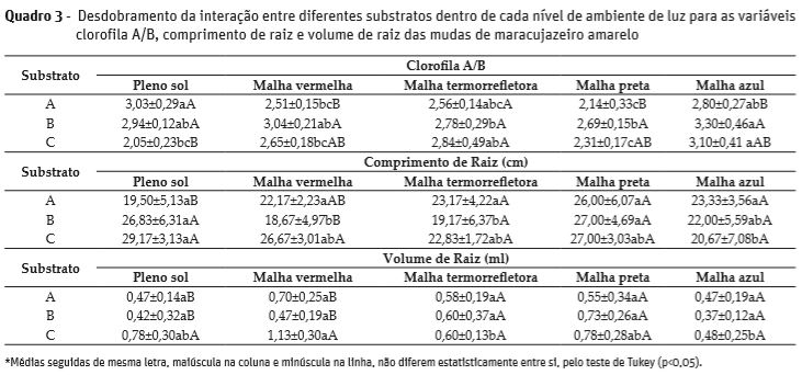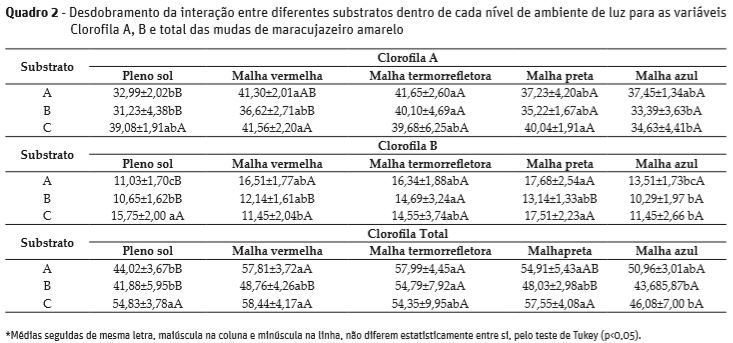Os teores de clorofila quando as mudas foram produzidas com o substrato B, na malha termorrefletora se diferenciou da malha azul e do ambiente a pleno sol. Já o substrato C, proporcionou maior índice de clorofila A para as mudas de maracujazeiro cultivadas na malha vermelha, a qual não se diferenciou da malha termorrefletora, preta e do ambiente a pleno sol. Costa et al. (2009) estudando o efeito dos diferentes ambientes, tipos recipientes e diferentes substratos em mudas de maracujazeiro encontrou mudas mais desenvolvidas nos ambientes malha preta e termorrefletora.