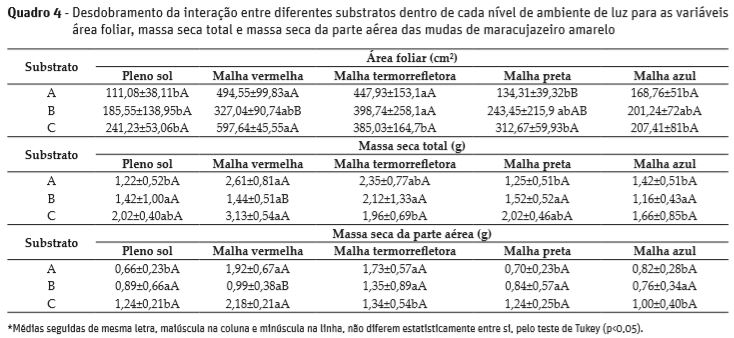 Na malha vermelha, as mudas de maracujá amarelo que obtiveram os maiores valores de massa seca total foram produzidas no substrato A e C, sendo que ambos diferiram do substrato B. As mudas cultivadas com o substrato C obtiveram as melhores médias para os ambientes com a malha vermelha, malha preta e pleno sol, sendo que estes dois últimos não diferiram das malhas termorrefletora e azul.