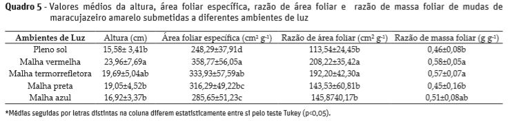 As maiores alturas das mudas de maracujazeiro foram observadas na malha vermelha e termorrefletora, sendo que a última não se diferenciou dos demais ambientes. Os menores valores foram obtidos no ambiente a pleno sol (Quadro 5).