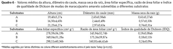 Os maiores valores de altura das mudas de maracujazeiro foram obtidos quando as mesmas foram produzidas com os substratos A e C, ambos diferindo do substrato B (Quadro 6).