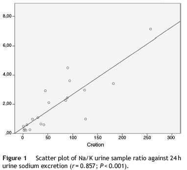 Introduction: The spot urine sodium/potassium (Na/Ku) ratio is a convenient tool to identify sodium excretion < 78 mequiv./d. It has been established that this ratio is as useful and accurate as 24-h urine sodium (Nau24h), but no Latin American study has evaluated this issue. The aim of this study is to evaluate the accuracy of the Na/Ku ratio and to compare it to Nau24h.