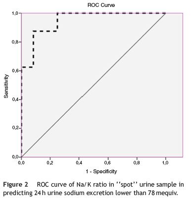 Stiehm et al. analysed 729 specimens of urine in 21 patients, a similar number of individuals included in this study.10 The circadian variability was assessed analysing the Na/Ku ratio according to diuretic administration in diferente day periods and no differences were demonstrated between groups. Likewise, Park et al. analysed two dosages Na/Ku ratio, in the morning and afternoon to check whether the not uniform sodium excretion during the day interfere in the ratios inferred.14 Apparently the urinary potassium excretion varies in accordance with sodium, maintaining the proportion at different times of day. The present study evaluated only a single urine sample from each patient, as previously published by El-Bokl et al. and Rojpalakorn et al.13,24