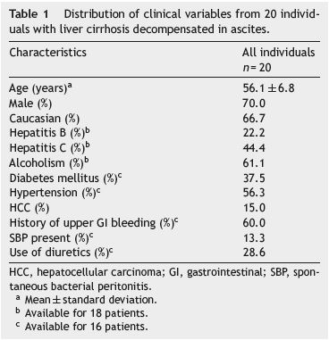 Material e métodos: Estudo transversal que incluiu 20 pacientes com cirrose hepática descompensada em ascite.