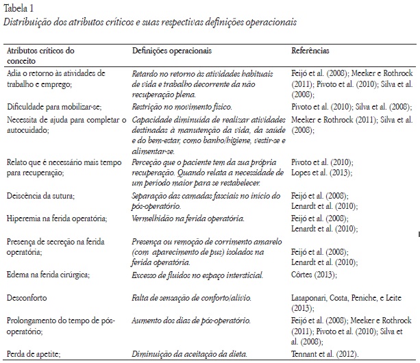 Com base na literatura científica, observa-se que a definição de «recuperação cirúrgica retardada» está ligada a uma ideia central, que pode ser definida pelo aumento do número de dias de pós-operatório, dificuldade para o autocuidado e demora na cicatrização da ferida, permitindo a discussão do conceito para a prática clínica (Feijó et al., 2008; Pivoto et al., 2010; Silva et al., 2008).
