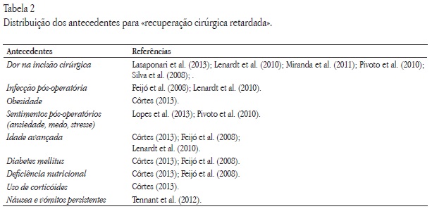 Os antecedentes são situações, eventos ou fenómenos que precedem o conceito de interesse, enquanto os consequentes correspondem ao que aconteceu como consequência, observados como resultados do conceito (Walker & Avant, 2011). Ou seja, os antecedentes podem preceder e/ou contribuir para retardo na cicatrização da ferida operatória e consequentemente prolongamento no tempo de recuperação cirúrgica do paciente, estes apresentados na Tabela 2.