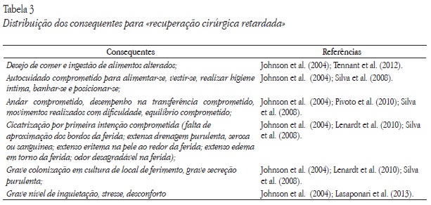 Com a revisão integrativa da literatura, identificou-se a escassez de utilização do conceito «recuperação cirúrgica retardada» na área da Enfermagem. Comummente, encontram-se enfermeiros que identificam no paciente integridade da pele prejudicada, mobilidade física prejudicada, dor aguda, prolongamento dos dias de internamento (Pivoto et al., 2010; Silva et al., 2008). Contudo, na literatura, são escassos os relatos referentes especificamente ao diagnóstico de Enfermagem «recuperação cirúrgica retardada» (Appoloni, Herdman, Napoleão, Carvalho, & Hortense, 2013; Santana et al., 2014). Tal não quer dizer que este fenómeno não ocorra na prática clínica. Porém, definido principalmente como complicações pós-operatórias e com uma concentração de estudos na área médica, no cuidado com deiscências, na prevenção de infeções pós-operatórias, na prevenção de complicações respiratórias, entre outras (Feijó, Cruz, & Lima, 2008; Lenardt, Melo, Betiolli, Seima, & Michel, 2010; Meeker & Rothrock, 2011).