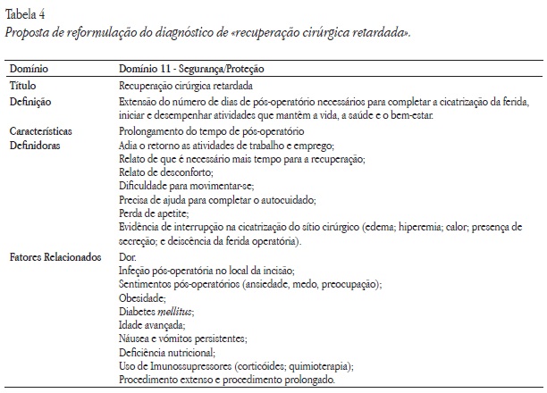 Alguns pesquisadores citaram fatores que poderiam influenciar a cicatrização da ferida operatória, porém não estão discriminados na classificação da NANDA-I como Fatores Relacionados do diagnóstico de «recuperação cirúrgica retardada» (Côrtes, 2013; Lenardt et al., 2010; Tennant et al., 2012 ). Sendo assim, foram acrescentados seis fatores relacionados: idade avançada, diabetes mellitus, deficiência nutricional, edema, uso de corticóides, e náusea e vómitos (Tabela 4).