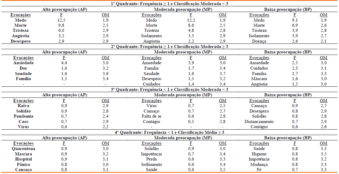 No 1º quadrante as evocações lembradas mais prontamente em todos os níveis de preocupação foram “medo”, “morte” e “tristeza” (ordem média [OM] = 1,9), sendo a palavra “medo” a principal em todos os grupos. Adicionalmente, apareceram também os termos “angústia” (OM = 2,9) e “desespero (OM = 2,9)” em AP, “isolamento” (OM = 2,9) e “angústia” (OM = 2,9) entre pessoas do MP, e “isolamento” (OM = 2,7) e “doença” (OM = 2,1) no BP; o que refletiu diferentes associações dos três principais termos de acordo com o nível de preocupação.