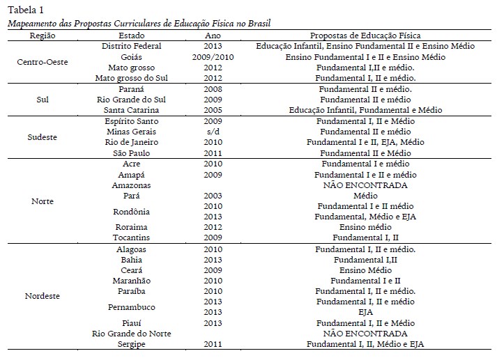 As propostas foram analisadas neste estudo em suas versões mais atualizadas, porém, a proposta curricular do Maranhão, embora apresente a versão de 2010, não apresenta proposta para a Educação Física, restando analisar a versão anterior de 2009, também disponibilizada no site.
