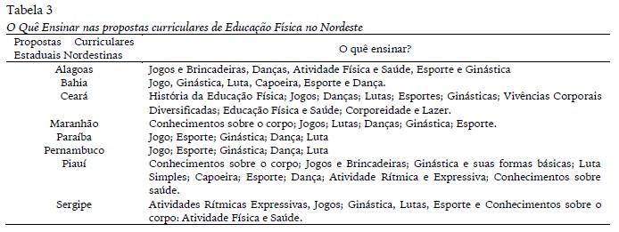 Já as propostas do Piauí e de Sergipe, ambas voltadas para o Ensino Fundamental e Ensino médio, em relação à do Maranhão, apresentam-se de forma mais esmiuçada, buscando aumentar o grau de complexidade dos conteúdos ao longo dos anos de escolarização, e trabalhar com os conteúdos: exame biométrico; crescimento físico; percepção corporal. Os demais conteúdos são acrescidos nos anos seguintes.