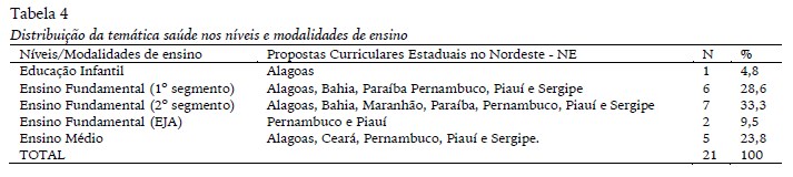 A tabela 3 regista que a saúde também é um tema privilegiado nas propostas no mesmo patamar das práticas corporais tradicionalmente abordadas nas aulas (Jogo, Dança, Ginástica, Luta e Esporte), especialmente nas propostas dos Estados de Alagoas, Ceará, Piauí e Sergipe. Esta constatação ganha força a partir da tabela 4, com a distribuição do conteúdo saúde nos níveis de ensino.