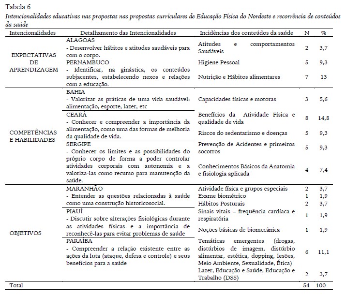 Estas intencionalidades, na tabela 6, anunciam a saúde como possibilidade de trato pedagógico nas aulas de EF, a partir, tanto de exemplos de seu detalhamento nos diferentes Estados, como das incidências dos conteúdos da saúde, ou seja, dos conteúdos que perpassam por todas as propostas curriculares nordestinas.