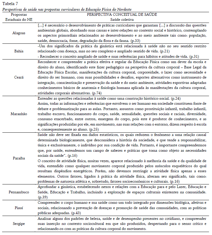 Observamos que, tanto nas intencionalidades quanto nos conteúdos das propostas, a saúde gira, predominantemente, em torno dos hábitos saudáveis numa perspectiva anátomo-fisiológica, à medida que partilham da concepção de saúde numa perspectiva de saúde coletiva, entendida como resultado de um conjunto de condições físicas, econômicas e socioculturais, relacionada à questão dos direitos social e humano, conforme tabela 7.