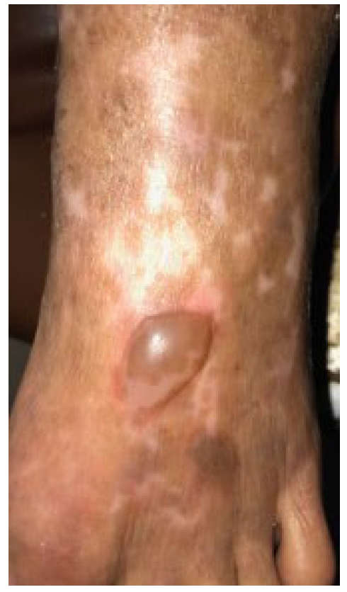 A psiquiatria notou o surgimento de bolhas no dorso do pé esquerdo (Fig. 1), solicitando o acompanhamento pela dermatologia.