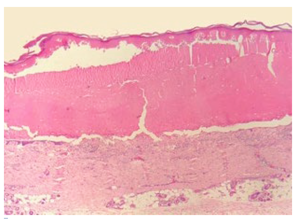Figura 4 Clivagem subepidérmica e vesículas espongióticas recobertas por epiderme com queratinócitos desprovidos de núcleo (H&E, x10).