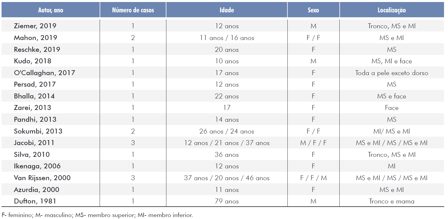 Foi realizada uma revisão da literatura através de artigos do PubMed, Embase e Scopus, utilizando-se os descritores “factitial dermatitis” OR “dermatitis artefacta” OR “pathomimia” AND “bullous”. A pesquisa revelou 16 relatos de PF bolhosa no período de 1981 a 2020 (Tabela 1),1,2,7-20sendo que 4 casos tiveram diagnóstico diferencial de PB.13,15-17Nestes 4, as lesões geralmente surgiram em jovens (entre 10-20 anos em 3 dos 4 casos), em ambos os sexos (2 homens e 2 mulheres); provocadas por aerossol spray, bico de mamadeira, mecanismo criotérmico não identificado e erva nativa; e em diversos locais (membros, face, tronco e mama).13,15-17Dufton et al mostraram bolha subepidérmica com imunofluorescência negativa,13 enquanto Kudo et al, necrose epidérmica, bolha suprabasal e subepidérmica com infiltrado perivascular mononuclear e imunofluorescência negativa.15 Já Reschke et al mostraram necrose epidérmica, bolha subepidérmica, infiltrado perivascular com linfócitos, eosinófilos e neutrófilos, além de queratinócitos multinucleados, edema da derme papilar e imunofluorescência negativa.17 Zarei et al não citaram o exame histopatológico e a imunofluorescência.16 Não foi descrita eosinofilia importante em nenhum dos casos.13,15-17Eles foram conduzidos com acompanhamento psiquiátrico, sem relato de recorrência das lesões.13,15-17Dufton et al referem que as lesões não recidivaram após a introdução da prednisona, apesar de, na evolução, o paciente revelar tê-las provocado.13,15-17