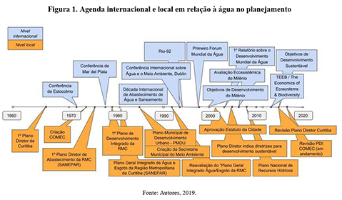 O ponto de partida desta investigação pode ser observado na Figura 1, que mostra de maneira linear os desdobramentos das políticas internacionais e seu reflexo nas implementações das respectivas medidas na escala local e metropolitana. Nesta pesquisa foram considerados com mais detalhe os desenvolvimentos no nível local e as especificidades do gerenciamento de recursos hídricos no Paraná, que conta com um arranjo institucional que difere do padrão federal. Para tal, este artigo se baseia na análise de quatro planos relevantes ao planejamento do abastecimento da RMC. Como complemento aos dados de Curitiba e Região metropolitana os autores conduziram uma entrevista com a Defesa Civil do Paraná em novembro 2017.