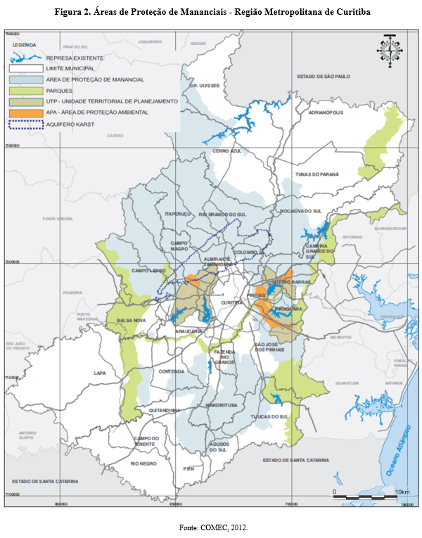 A Figura 2 demonstra a abrangência da RMC e as áreas de proteção de mananciais, marcadas em cinza. Estas áreas foram delimitadas pela COMEC buscando facilidade na gestão e controle do uso e ocupação do solo, garantindo a qualidade da água para abastecimento público. Atualmente o abastecimento da RMC é realizado por mananciais localizados em Piraquara, Campina Grande do Sul, Quatro Barras, Pinhais, Araucária, Campo Largo, Campo Magro, Almirante Tamandaré, Curitiba e São José dos Pinhais (COMEC, 2017).
