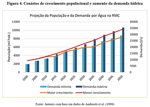 Assim como a metodologia utilizada nos Planos de Recursos Hídricos Nacional (PNRH) e Estadual do Paraná (PLERH), o Plano de Bacias trabalha com cenários, resultando em planejamento estratégico para orientação de decisões acerca dos prognósticos. Para definição dos cenários são considerados os seguintes aspectos: taxa de crescimento populacional, uso e ocupação do solo, distribuição da população nos municípios, e ocupação do solo nas sub-bacias da RMC (Águas Paraná, 2007). Porém, ainda não se tem evidência nesta época sobre a incorporação dos princípios do GIRH no nível subnacional. Somente em 2012, em volta de 80% de todos os países tinham integrado esses princípios nas suas legislações e ? possuíam planos nacionais de GIRH (Niasse e Cherlet, 2015). Andreotti et al. (1999) analisam dois cenários nos quais a demanda por água cresce mais que a população, como pode ser observado na Figura 4.