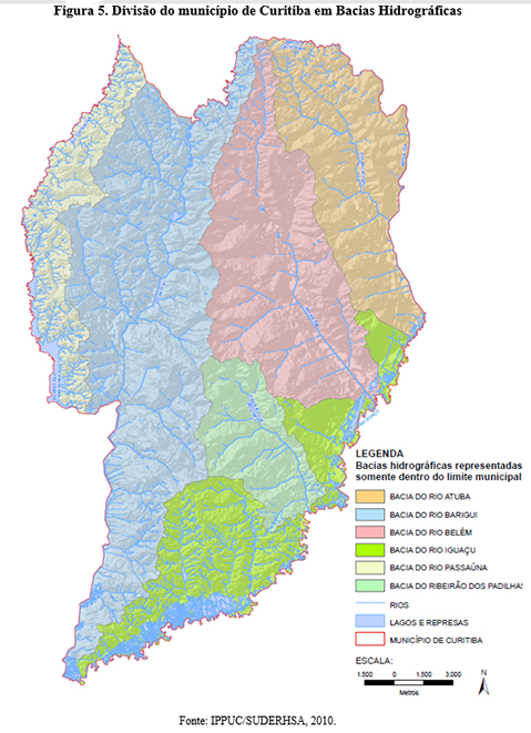 Neste contexto, Curitiba é dividida em seis sub-bacias hidrográficas, contendo seus principais rios: Barigui, Belém, Passaúna, Ribeirão dos Padilhas, Atuba e Iguaçu, conforme ilustra a Figura 5. No entanto, para o abastecimento de água na cidade, são utilizados os rios Iguaçu (com a captação fora de Curitiba), Passaúna (único manancial aproveitável na cidade), Iraí, e Miringuava (GADDA et al., 2018).