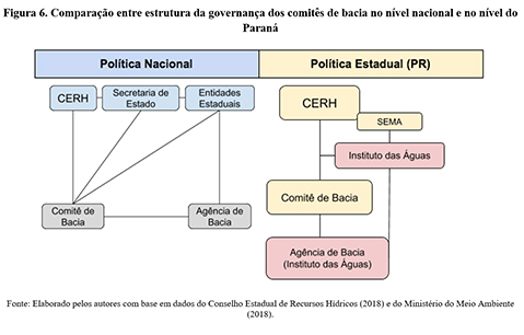 A diferença de outros estados, o Paraná conta com uma estrutura particular com o Instituto das Águas (em vermelho na Figura 6), que age ambos como órgão executivo e ao mesmo tempo como fiscalizador no sistema. Nas diretivas pela política nacional, os comitês de bacia, como unidade mais local, ficam independentes, mas cooperando com os órgãos estaduais. No caso do Paraná a agência de bacia fica justamente representado pelo Instituto das Águas o que não garante uma separação entre estabelecimento de metas e fiscalização independente, senão uma “sobreposição institucional”. Nas palavras de Hojda et al., 2014: