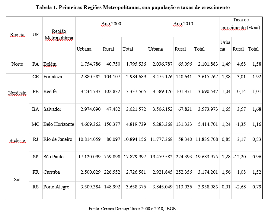 As primeiras Regiões Metropolitanas (RMs) criadas no Brasil datam do início da década de 1970 e apresentam todas população atual superior a dois milhões de habitantes (Barreto, 2017). De acordo com Lemos (2003) estas regiões representam mais de 30% da população brasileira, e são consideradas aglomerações de grande porte. Um fenômeno observado nos últimos censos realizados pelo IBGE é a desaceleração no ritmo de crescimento da população na maior região metropolitana do Brasil, São Paulo. Este comportamento, porém, não se mantém para outras RMs, que apresentam taxas de crescimento acima da média brasileira, como é o caso de Curitiba. A Tabela 1 apresenta as primeiras RMs brasileiras e suas respectivas taxas de crescimento entre os censos de 2000 e 2010. As altas taxas de diminuição de população rural apontam para o contínuo crescimento nas franjas das regiões metropolitanas, especialmente naquelas de tamanho médio, como é o caso de Curitiba.