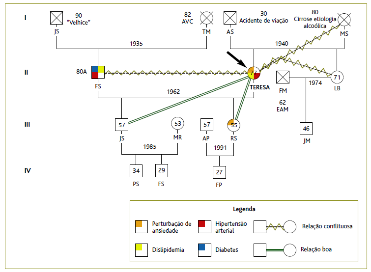 Teresa iniciou o seguimento no atual médico de família em setembro/2018, tendo como problemas ativos nessa data a presença de HTA, dislipidemia e perturbação de ansiedade. Como medicação habitual encontrava-se a realizar carvedilol 25 mg (0+0+1) desde “há vários anos, por sentir o coração acelerado” (sic). Tratava-se de uma utente com resistência a qualquer instituição ou mudança terapêutica sugerida pelo médico de família. Mantinha valores de PA marcadamente elevados nas consultas de seguimento (Tabela 1), mas insistia que não pretendia alterar a sua medicação habitual. Perante estes valores foi por duas vezes solicitada uma automedição da pressão arterial (AMPA), que a utente não chegou a realizar. Concordou posteriormente com a realização de uma monitorização ambulatorial da pressão arterial (MAPA), em fevereiro/2020, que documentou “HTA sistólica nas 24 horas com cargas tensionais muito elevadas, sobretudo durante o sono”. Perante o resultado da MAPA e valores de PA novamente elevados em contexto de consulta (PA 166/96 mmHg), a utente é alertada para os riscos associados a esta condição e insiste-se na alteração da medicação, que a utente rejeita de forma perentória. Assim, o médico estava perante um caso de má adesão terapêutica/não adesão às propostas sugeridas, um dos motivos que devem motivar a realização de uma avaliação familiar. Neste contexto, convocou-se a utente para uma entrevista com objetivo de compreender o porquê da relutância à otimização terapêutica e, desse modo, tentar delinear estratégias que permitissem melhorar o seu estado de saúde.