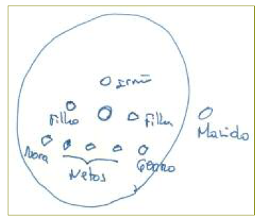 Da representação feita por Teresa no Círculo Familiar de Thrower (Figura 2) destaca-se a forma como posiciona a irmã, os filhos, a nora, os netos e o genro como praticamente equidistantes de si própria. Quando questionada do porquê desta representação, Teresa refere que a sua família é para si toda igualmente chegada, não fazendo distinção nas relações que estabelece com cada elemento. Apesar de estar atualmente de relações cortadas com a irmã, Teresa continua a representá-la perto de si, justificando este facto com as dificuldades que ambas ultrapassaram juntas e o apoio que foram uma para a outra ao crescerem com uma mãe alcoólica. O marido de Teresa é representado totalmente fora do círculo - mais uma vez, representativo da sua relação tumultuosa. Quando Teresa precisa de ajuda refere que a pessoa a quem recorre com mais facilidade é a filha, com quem mantém uma relação muito próxima. Quando questionada sobre como mudaria o seu círculo, caso tivesse a capacidade para alterar a dinâmica familiar, Teresa emociona-se e diz que “gostaria muito de ter uma relação próxima com o marido” (sic) e relata novamente com mágoa a história de adultério.