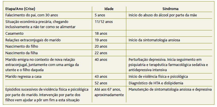 Recorrendo à Linha de Vida de Medalie (Tabela 2) e analisando em retrospetiva, a utente dá relevância a eventos que marcaram a sua vida e destaca-se uma figura central - o marido. Inclusivamente há um foco no período da emigração do marido e consequente início de uma nova relação extraconjugal com uma amiga da utente. Nesta fase da avaliação familiar, Teresa revela uma grande labilidade emocional e discorre acerca dos problemas conjugais e da história de adultério que marcaram o seu casamento desde o início. No contexto da relação extraconjugal anteriormente referida, a utente terá iniciado seguimento em consultas de psiquiatria, tendo sido submetida, de acordo com a mesma, a uma terapêutica farmacológica intensiva, com a ingestão de grande quantidade de fármacos, associados a vários efeitos adversos. Refere, então, que qualquer adição à quantidade de comprimidos que toma diariamente e o receio dos efeitos adversos a remetem para um período muito conturbado da sua vida, fazendo-a recordar a traição do marido e o sofrimento físico e psicológico que se seguiu. Deixa, assim, a descoberto o motivo para a relutância na alteração da medicação que tem manifestado ao longo dos anos.
