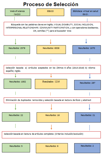 Criterios de Inclusión para el proceso de selección son los siguientes: El tipo de estudio Cualitativos, cuantitativos, mixtos; Primarios y secundarios. Tipo de indicadores: estudios que incluyan las palabras claves VISUAL DISABILITY, SOCIAL INCLUSION, INTERPERSONAL RELATIONSHIPS, COMMUNITY PARTICIPATION. Perfil: Población adulta con discapacidad visual. Criterio temporal: Publicaciones posterior al año 2013. Criterio lingüístico: Publicaciones en inglés, español y portugués. Criterio geográfico: Publicaciones a nivel global.