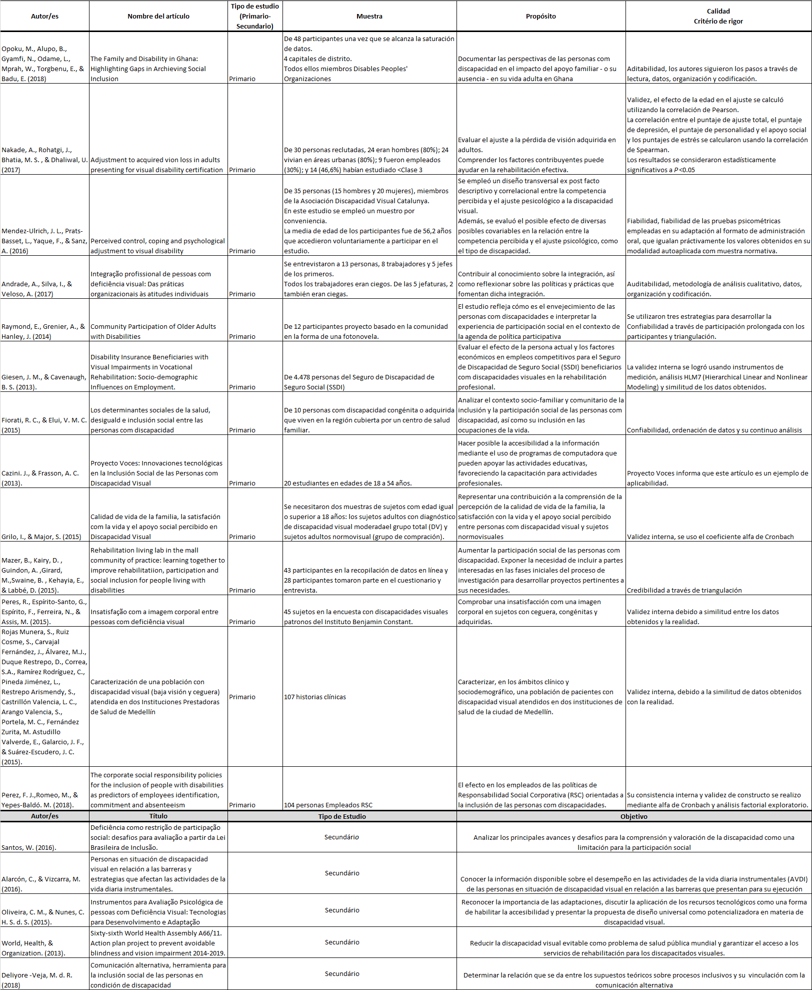 La descripción de los artículos fue organizada en cuatro categorías teóricas, siguiendo el objetivo de investigación: (a) Discapacidad visual y relaciones interpersonales (b) relaciones interpersonales en el proceso de inclusión social (c) Participación comunitaria en el proceso de inclusión social de personas con discapacidad visual y (d) Barreras para la inclusión social en las personas con discapacidad.