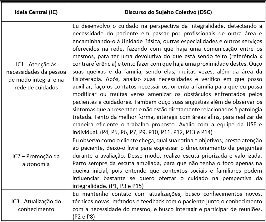 Quadro 1 IC e DSC dos fisioterapeutas da APS sobre como é desenvolvido o cuidado na perspectiva da integralidade no cotidiano do trabalho, Marília, 2018.