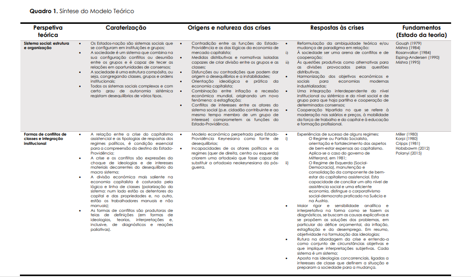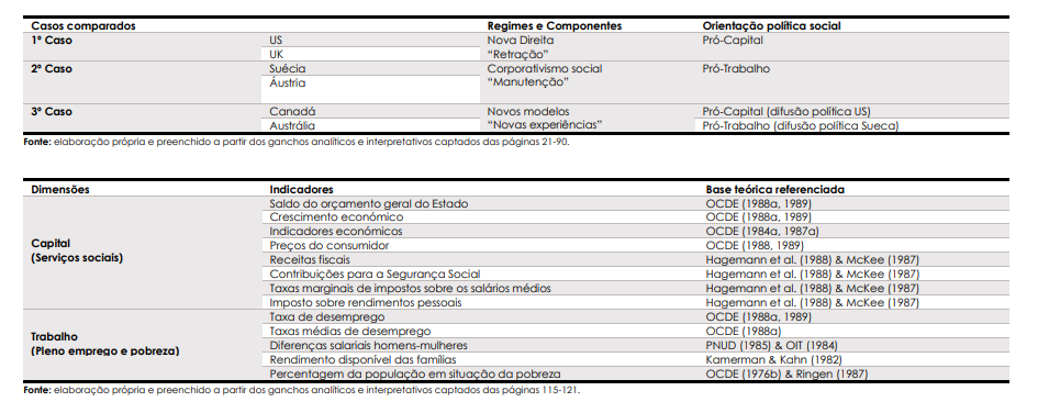 Em relação aos procedimentos metodológicos deste artigo, estabeleceu-se uma lógica de sistematização e de análise assentes em quadros teóricos e empíricos, com vista a favorecer a análise crítica sobre os fatores facilitadores ou limitadores da metodologia de comparação em políticas sociais. Assumiu-se, a partir deste constructo lógico, dois modelos de análise para, por um lado, encaixar as diferentes e dispersas dimensões e indicadores de análise referentes aos casos comparados por Mishra e, por outro, para tentar captar os fundamentos de razão para tipificação dos mesmos casos - ver anexos.