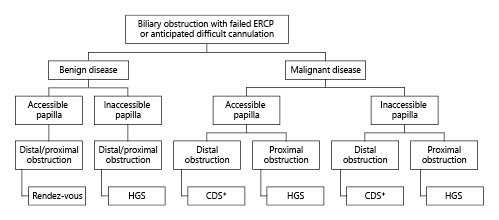 In cases of malignant biliary obstruction after failed ERCP, CDS should be performed for distal obstruction and HGS for proximal obstruction.