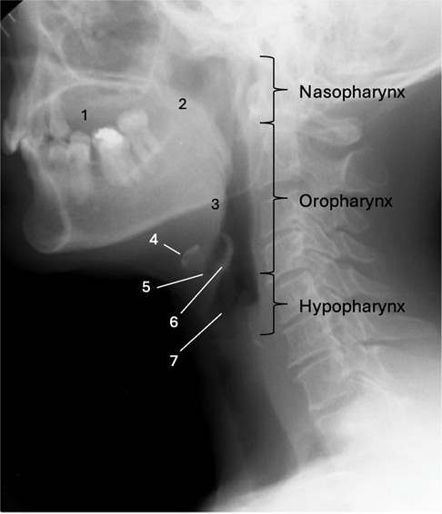 Figure 1: Radiographic anatomical landmarks on lateral view.1 - oral cavity; 2 - soft palate; 3 - base of the tongue; 4 - hyoid bone; 5 - vallecula; 6 - epiglottis; 7 - laryngeal vestibule