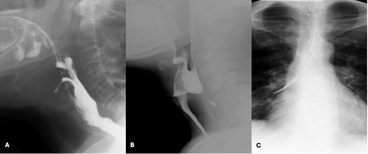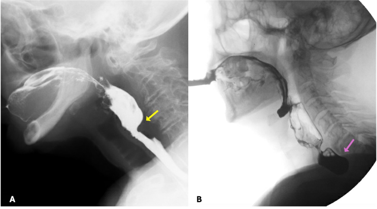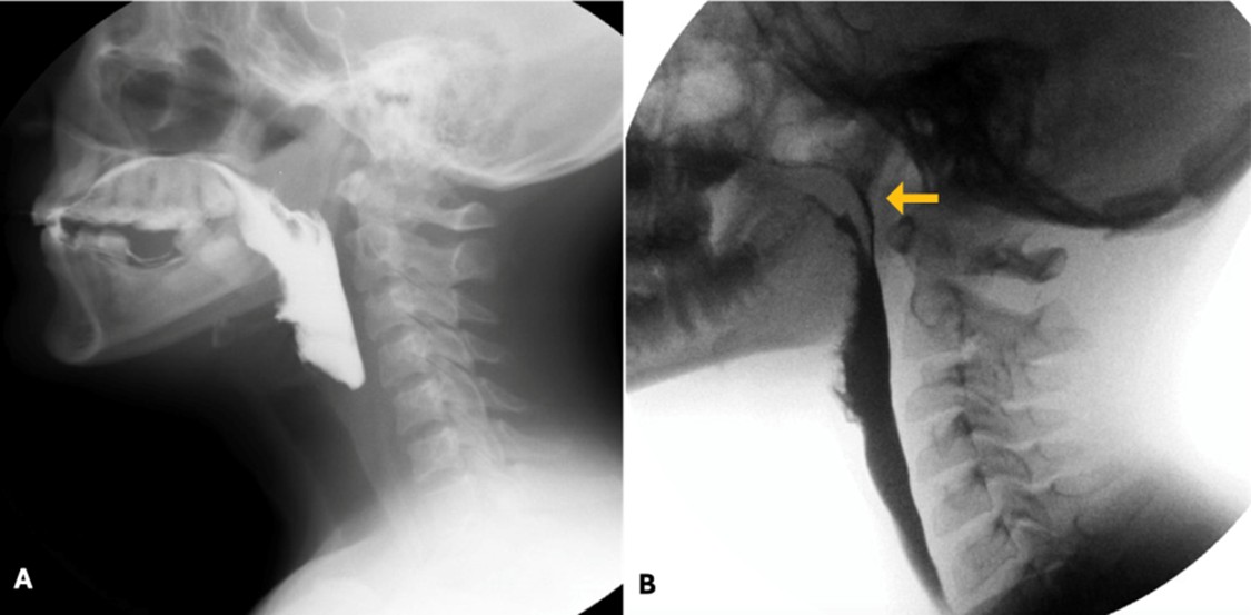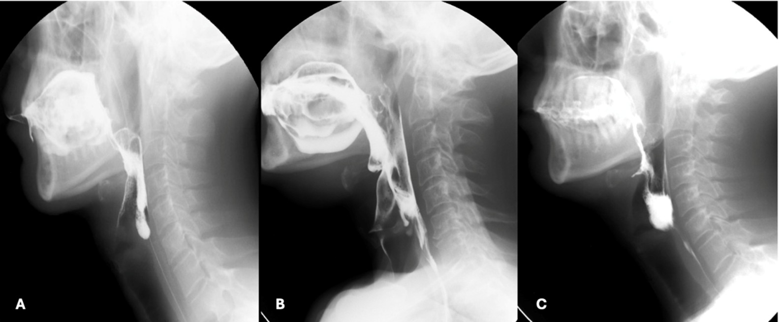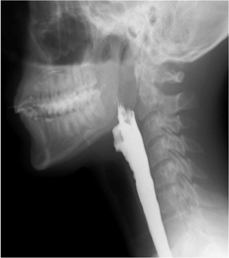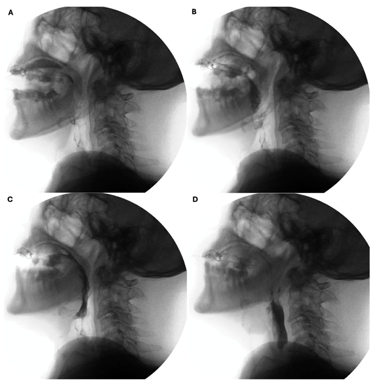 Lateral views are obtained for most of the examination and the field-of-view should include the oral and pharyngeal cavities, the posterior cervical spine, and the upper cervical oesophagus. Frontal views are limited to one or two boluses to evaluate pharyngeal symmetry, and it is often necessary to ask the patient to extend their neck slightly to improve visualization of the pharynx.23 Given that a considerable amount of oropharyngeal dysphagia is caused by referred oesophageal pathology, we usually perform a limited esophagogram in the antero-posterior and left posterior oblique positions to rule out other causes of dysphagia.5,11