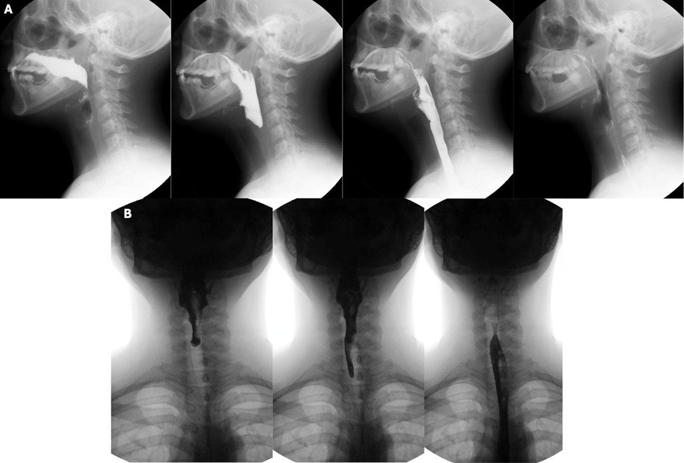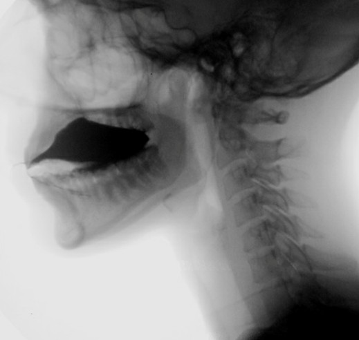 Deglutition or swallowing is a primary function that encompasses the processes by which food is transformed and transported to the oesophagus. It is a complex and precise neuromuscular mechanism that allows nutrition and prevents food from inappropriately accessing the airway. Clinical evaluation of swallowing is complemented by videofluoroscopy, which offers a dynamic assessment of deglutition and reveals clinically occult information.1