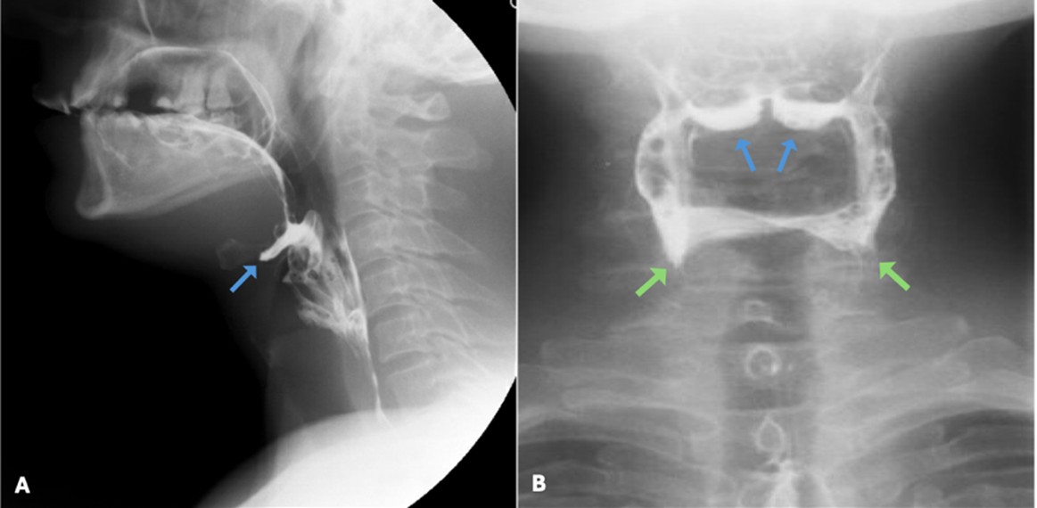 Figure 14: Pharyngeal residues in the vallecula (blue arrows) and piriform sinuses (green arrows) in lateral (A) and anterior-posterior (B) views