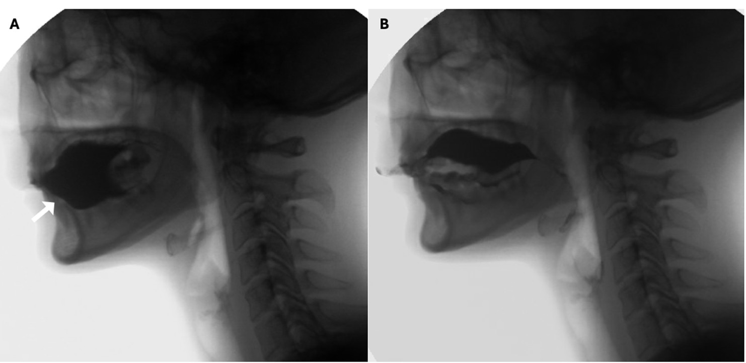 Figure 5: Dipping pattern of bolus hold. Notice that before swallowing the contrast rests on the floor of the mouth (white arrow in A). In the oral propulsive phase, the tongue shows a spoon-like movement that scoops the entirety of the bolus (B)