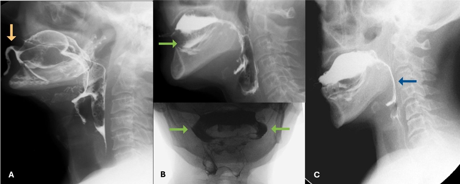 Figure 11: Range of underlying causes for compromised airway protection. (A) Posterior bolus escape from the oral cavity resulting in laryngeal penetration before the pharyngeal phase of deglutition; (B) Aspiration of contrast during the pharyngeal phase of deglutition due to delayed triggering of the swallow reflex; (C) Persistent pharyngeal residues that resulted in the aspiration seen in the panel B of figure 10