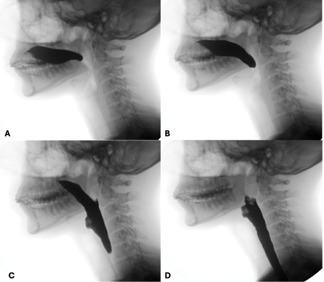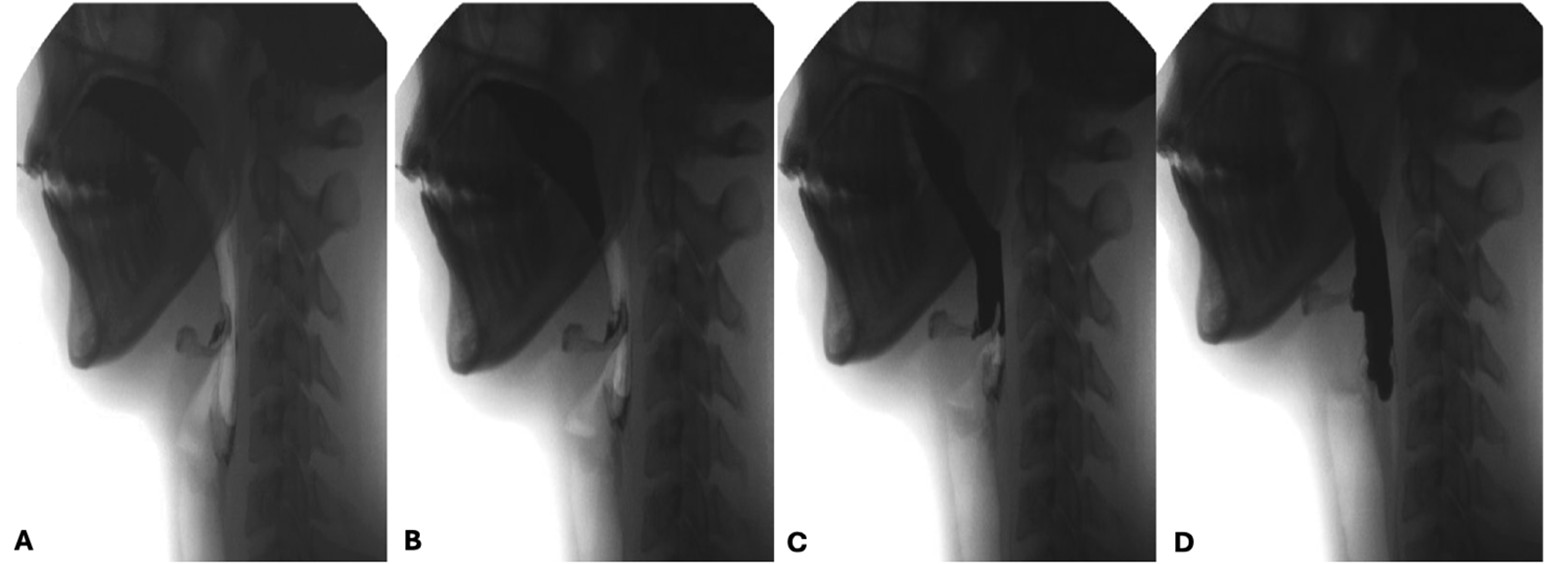 Figure 7: Oral propulsive phase. Notice the tongue eversion and soft palate relaxation (A and B) with transfer of the bolus to the pharynx (C and D)