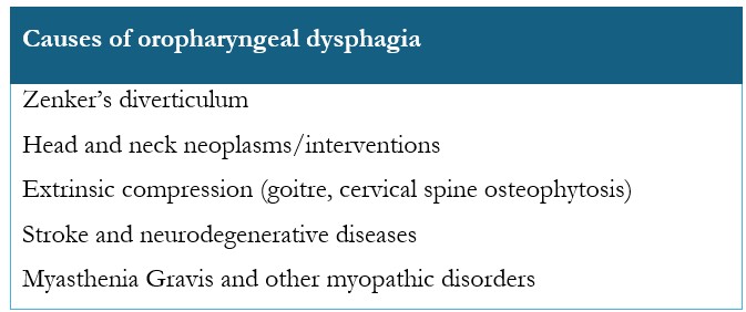 Oropharyngeal dysphagia may arise from a range of causes, such as anatomical/structural abnormalities, neurological conditions or myopathic disorders, and the most common aetiologies are summarized in Table 1.