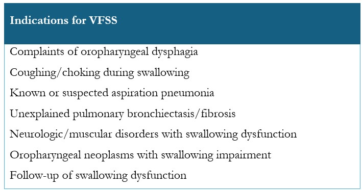 VFSS is a valuable tool that provides anatomical and functional assessment of the structures involved in swallowing. Assessment of aspiration risk is a primary clinical application, with additional indications outlined in Table 2.