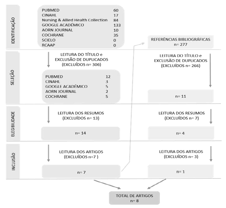 Na segunda etapa, e com os termos a utilizar já identificados, realizou-se a pesquisa nas bases de dados PubMed Central, Google Académico, Scientific Electronic Library Online, (SciELO), ResearchGate e Repositório Científico de Acesso Aberto de Portugal (RCAAP). Via EBSCOhost procedeu-se à pesquisa na CINAHL, Nursing & Allied Health Collection, Cochrane Central Register of Controlled Trials, Cochrane Database of Systematic Reviews, Cochrane Methodology Register. A fórmula boleana em que se fundamentou a pesquisa foi “patient satisfaction” AND (“perioperative nursing” OR “nursing interventions”) AND “operating room”, nas suas adaptações às diferentes bases de dados científicas, ou seja, utilizando os termos selecionados como termos indexados ou como termos naturais.