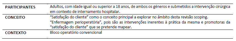 Qualquer revisão bibliográfica tem por objetivo responder a uma questão, e as revisões scoping não são exceção. Tendo-se adotado a metodologia do JBI, a mnemónica PCC (Participantes, Conceito e Contexto) foi utilizada para a construção da questão de revisão (tabela 1). Assim, a questão que orientou a presente revisão é: “Quais as dimensões da satisfação do cliente com os cuidados de enfermagem no bloco operatório?”.