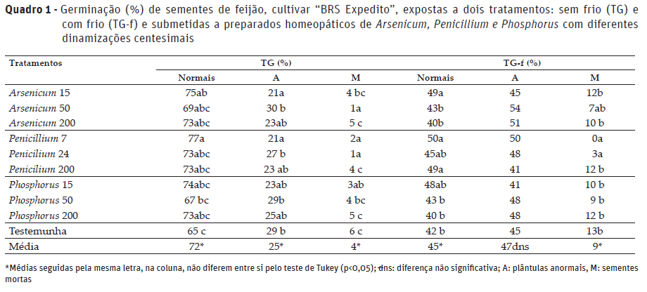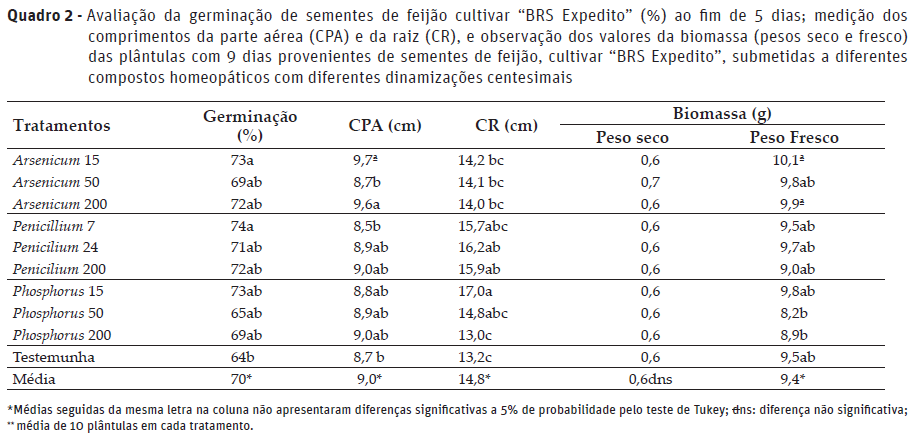 Observou-se um efeito significativo dos tratamentos na germinação das sementes de feijão, conforme observado no Quadro 2. A percentagem de sementes germinadas apresentou um valor médio de 70%, resultado que pode ser considerado baixo para o ensaio de germinação, já que segundo a Instrução Normativa 45/2013, a percentagem mínima exigida para a comercialização de sementes de feijão é de 80%. Os tratamentos das sementes com Arsenicum CH 15, Penicillium CH 7 e Phosphorus CH 15 proporcionaram os melhores resultados na germinação, embora insuficientes.