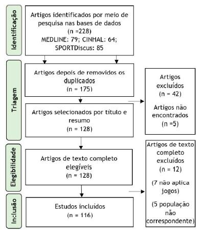 Pela pesquisa científica realizada nas diferentes bases de dados, obtiveram-se 228 artigos. Após as diferentes etapas apresentadas na Figura 1 foram selecionados 128 artigos para leitura integral dos quais, 116 foram incluídos nesta revisão.