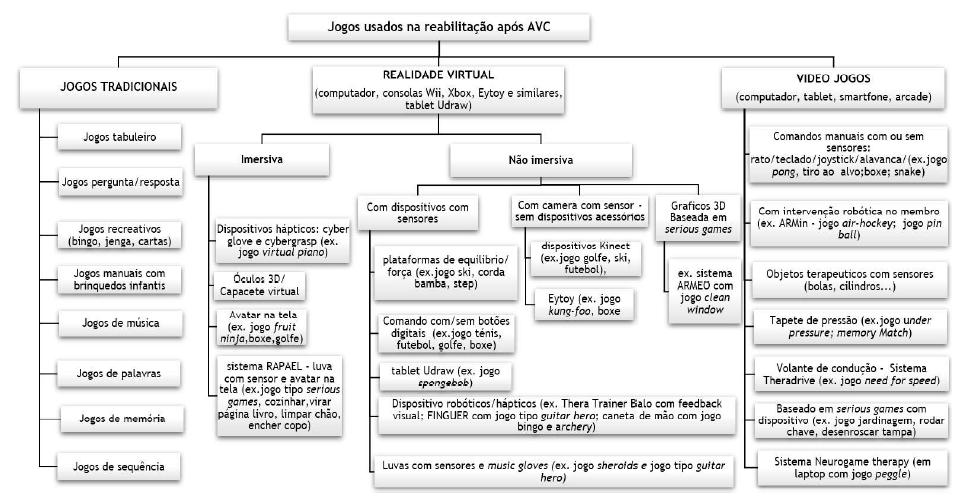 O objetivo desta scoping review foi mapear e analisar os jogos usados na reabilitação dos indivíduos após AVC. Foram obtidos 116 estudos onde foi possível identificar três grandes agrupamentos de jogos: Jogos de Realidade Virtual imersiva e não imersiva, videojogos e Jogos Tradicionais. Estes jogos foram usados para a reabilitação da função motora global e da função cognitiva em pacientes com AVC, sendo que a maioria dos jogos identificados foram usados para a recuperação da função motora do MS.