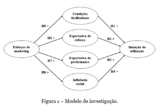 O modelo de investigação proposto neste trabalho tem como base a teoria unificada de aceitação e uso de tecnologia (UTAUT), desenvolvida por Venkatesh, Morris, Davis e Davis (2003), a qual foi reforçada com a inclusão dos esforços de marketing, indispensáveis na fase inicial de adoção deste tipo de serviços (Lin, Wang, & Hwang, 2010).